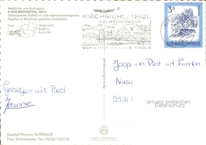 72411540 alte Postkarte Mariastein Tirol Panorama Schloss Kapellen Fliegeraufnahme postalisch gelaufen Erhaltung siehe scans KatCode: 11390335070516