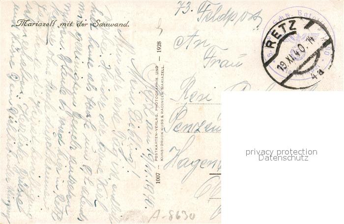 43030832 alte Postkarte Mariazell Steiermark Ortsansicht mit Basilika und Sauwand Muerzsteger Alpen NZ4 postalisch gelaufen Feldpost Erhaltung siehe scans [FriedD77] KatCode: 11390223060210