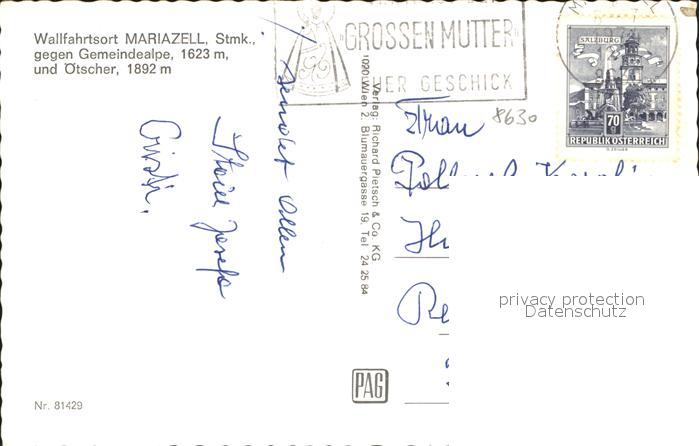 71566308 alte Postkarte Mariazell Steiermark Panorama gegen Gemeindealpe und oetscher Ybbstaler Alpen Busfahrt postalisch gelaufen Erhaltung siehe scans KatCode: 11390223060210