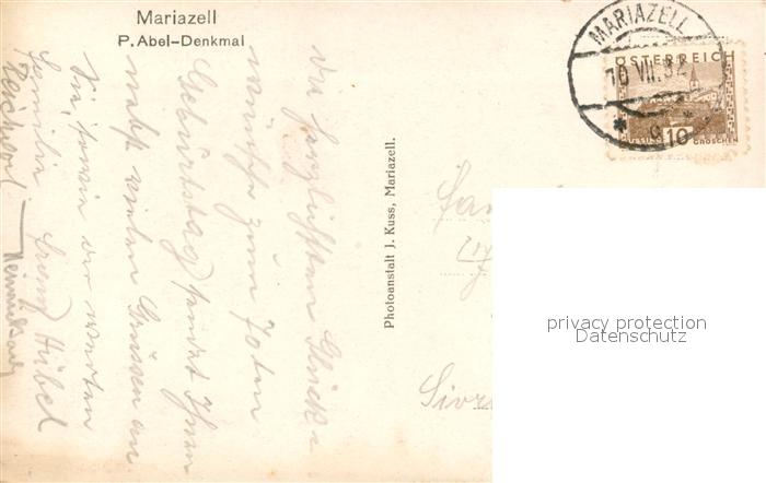 43055284 alte Postkarte Mariazell Steiermark Pater Abel Denkmal postalisch gelaufen Erhaltung siehe scans [FriedD77] KatCode: 11390223060210