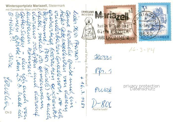 73149059 alte Postkarte Mariazell Steiermark Winterpanorama mit Gemeinde Alpe und oetscher Ybbstaler Alpen postalisch gelaufen Erhaltung siehe scans [FriedD77] KatCode: 11390223060210