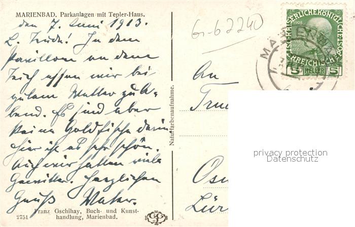 old postcard Marienbad Tschechien Boehmen Parkanlagen mit Tepler Haus postalisch gelaufen Erhaltung siehe scans [WerneD78]