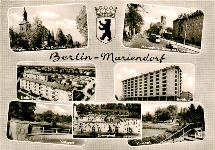 73910529 alte Postkarte Mariendorf Berlin Mariendorfer Damm mit Dorfkirche Ullsteinhaus Siedlung Hochhaus Volkspark Sommerbad postalisch gelaufen Erhaltung siehe scans [WerneD78] KatCode: 11110011000000