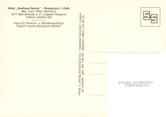 73761088 Marienheide an der Lingese Talsperre Hotel Seehaus Nanny Restaurant Cafe Fliegeraufnahme postalisch nicht gelaufen Erhaltung siehe scans [WerneD78] KatCode: 11110005374024