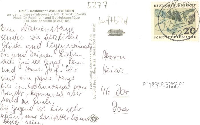 73698102 alte Postkarte Marienheide Cafe Restaurant Waldfrieden Lingese Talsperre postalisch gelaufen Fliegeraufnahme Erhaltung siehe scans [FriedD77] KatCode: 11110005374024