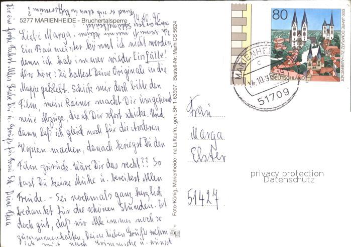 72015991 alte Postkarte Marienheide Fliegeraufnahme Bruchertalsperre postalisch gelaufen Erhaltung siehe scans KatCode: 11110005374024