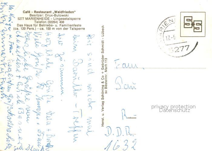 73843979 alte Postkarte Marienheide Haus Waldfrieden Gastraeume Lingesetalsperre postalisch gelaufen Erhaltung siehe scans [WerneD78] KatCode: 11110005374024