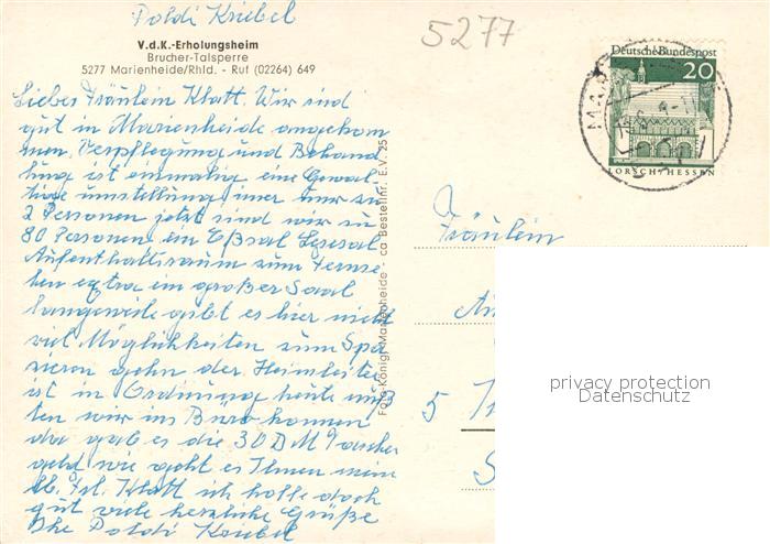 73758189 alte Postkarte Marienheide VdK Erholunsheim an der Brucher Talsperre postalisch gelaufen Erhaltung siehe scans [FriedD77] KatCode: 11110005374024