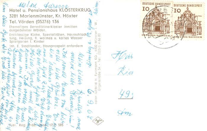 73911551 alte Postkarte Marienmuenster Hotel und Pensionshaus Klosterkrug postalisch gelaufen Fliegeraufnahme Erhaltung siehe scans [WerneD78] KatCode: 11110005762024