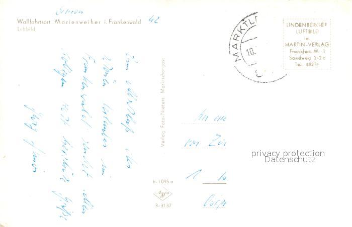 72979556 alte Postkarte Marienweiher Wallfahrtsort im Frankenwald Fliegeraufnahme postalisch gelaufen Erhaltung siehe scans [FriedD77] KatCode: 11110009477138