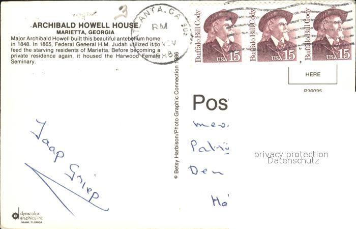 72492568 old postcard Marietta Georgia Archibald Howell House postalisch gelaufen Erhaltung siehe scans KatCode: 14140120000000