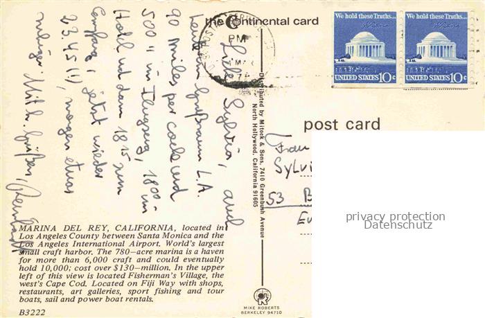 74037525 old postcard Marina Del Rey California Fliegeraufnahme postalisch gelaufen Erhaltung siehe scans [WerneD78] KatCode: 14140050000000