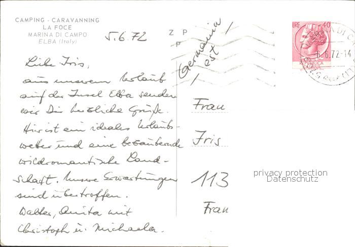 alte Postkarte Marina di Campo Camping Caravaning La Foce postalisch gelaufen Erhaltung siehe scans