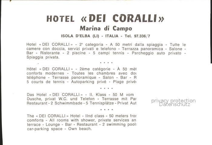 Marina di Campo Hotel Dei Coralli postalisch nicht gelaufen Werbekarte (keine Postkarte) Erhaltung siehe scans