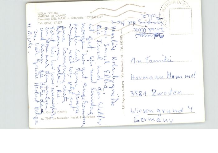 old postcard Marina di Campo Isola Elba Camping del Mare Ristorante Corallo postalisch gelaufen