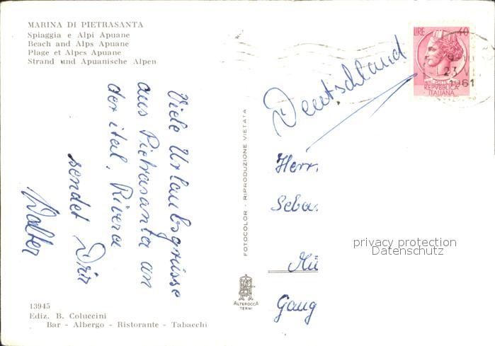 old postcard Marina di Pietrasanta Spiaggia e Alpi Apuane Strand Apuanische Alpen postalisch gelaufen Erhaltung siehe scans