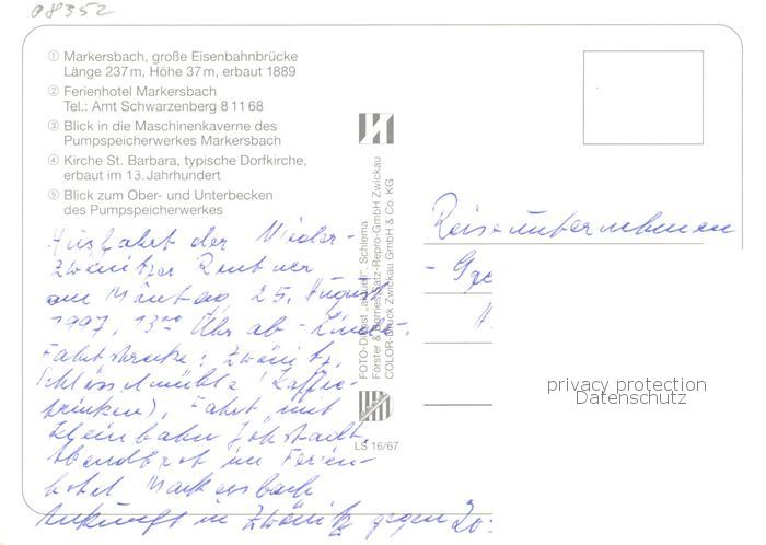 73840372 Markersbach Bad Gottleuba Eisenbahnbruecke Ferienhotel Markersbach Maschinenkaverne des Pumpspeicherwerkes Kirche St Barbara Pumpspeicherwerk Fliegeraufnahme postalisch nicht gelaufen Erhaltung siehe scans [FriedD77] KatCode: 11110014287015