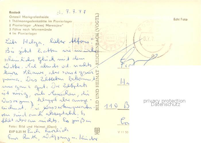 73751047 alte Postkarte Markgrafenheide Rostock Thaelmanngedenkstaette im Pionierlager Alexej Maressjew Faehre nach Warnemuende Pionierlager postalisch gelaufen Erhaltung siehe scans [WerneD78] KatCode: 11110013003000
