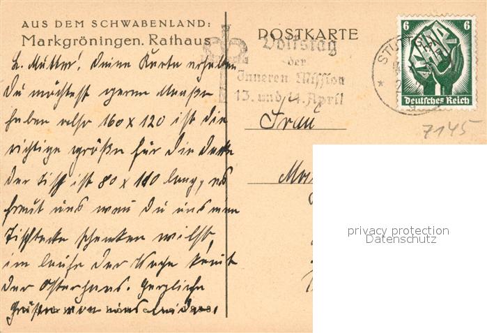 43350676 alte Postkarte Markgroeningen Rathaus Fachwerkhaus postalisch gelaufen Erhaltung siehe scans [FriedD77] KatCode: 11110008118050