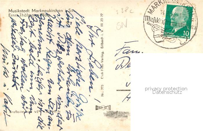 72981923 alte Postkarte Markneukirchen Ernst Thaelmann Platz Brunnen Musikstadt postalisch gelaufen Erhaltung siehe scans [FriedD77] KatCode: 11110014178330