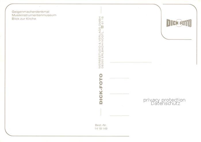 73269028 Markneukirchen Geigenmacherdenkmal Musikinstrumentenmuseum Kirche Wappen Landschaftspanorama postalisch nicht gelaufen Erhaltung siehe scans [FriedD77] KatCode: 11110014178330