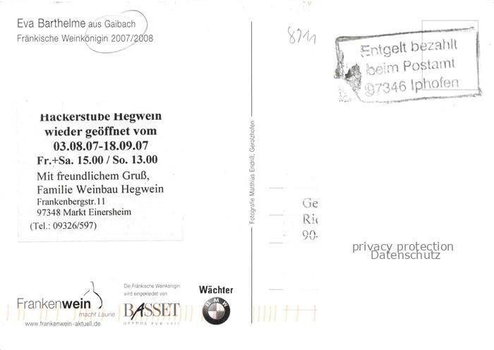 74054373 Markt Einersheim Eva Barthelme Fraenkische Weinkoenigin postalisch nicht gelaufen Erhaltung siehe scans [WerneD78] KatCode: 11110009675148