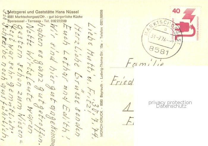 73751478 alte Postkarte Marktschorgast Metzgerei und Gaststaette Hans Nuessel Gastraeume postalisch gelaufen Erhaltung siehe scans [WerneD78] KatCode: 11110009477139