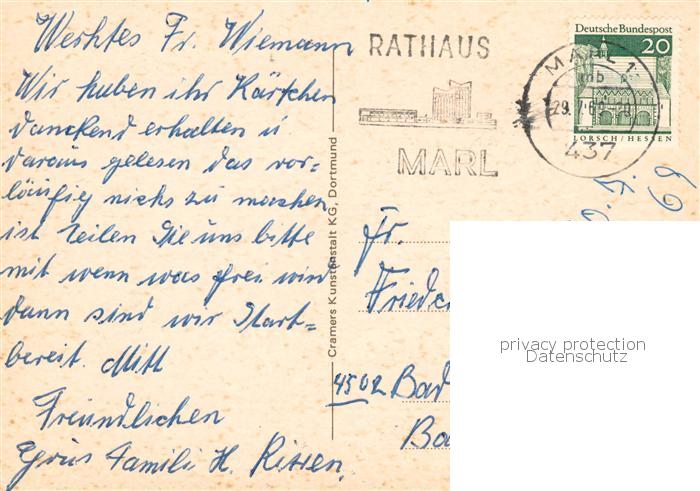 73873642 alte Postkarte Marl Westfalen Chemische Werke Huels Paracelsus Klinik Am Gaensebrink Parkbad der Loemuehle postalisch gelaufen Erhaltung siehe scans [WerneD78] KatCode: 11110005562024
