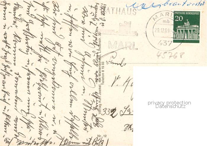 73865467 alte Postkarte Marl Westfalen Parkanlagen Gaensebrink Skulpturen Teich Hospital City Hallenbad Huegelhaus Rathaus postalisch gelaufen Erhaltung siehe scans [FriedD77] KatCode: 11110005562024