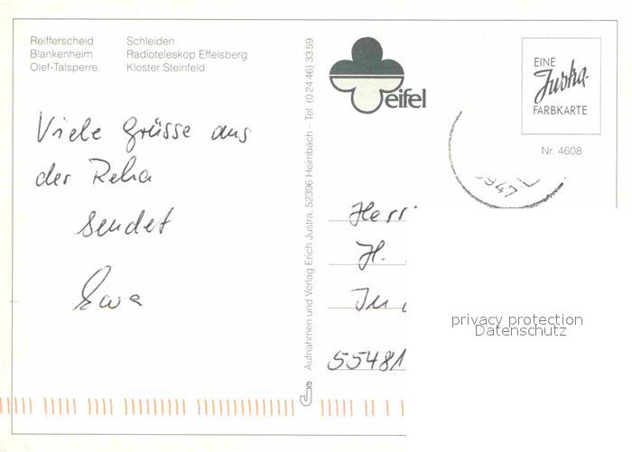 72909054 alte Postkarte Marmagen Eifelhoehenklinik Reifferscheid Blankenheim Oleftalsperre Schleiden Radioteleskop Effelsburg Kloster Steinfeld postalisch gelaufen Erhaltung siehe scans [FriedD77] KatCode: 11110005366032