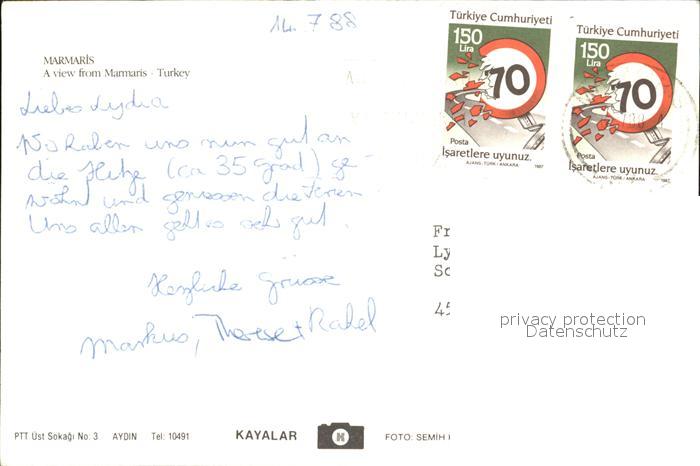 old postcard Marmaris Panorama Kuestenstadt Hafen Berge postalisch gelaufen Erhaltung siehe scans