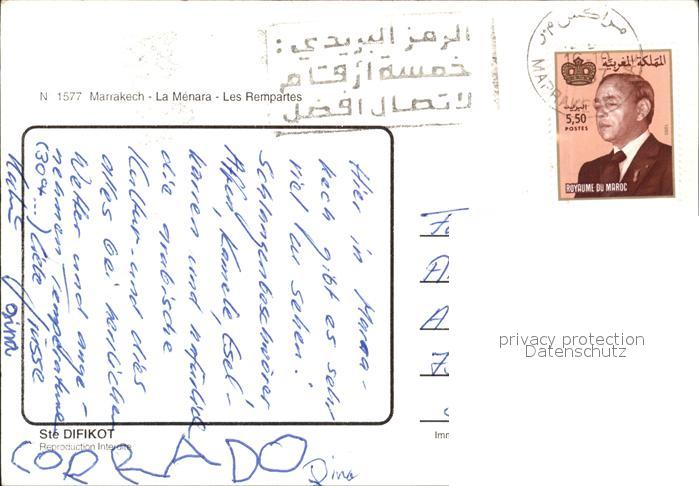 alte Postkarte Marrakech Marrakesch Teilansicht mit Tempel und Kamelen Les Rempartes postalisch gelaufen Erhaltung siehe scans [AndreD76 kt121box]