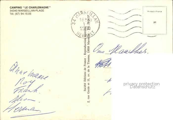 12003094 carte postale Marseillan Herault Camping Le Charlemagne postalisch gelaufen Erhaltung siehe scans KatCode: 11170034134150