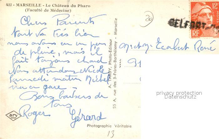 13493746 carte postale Marseille Bouches-du-Rhone Le Chateau du Pharo postalisch gelaufen Erhaltung siehe scans [WerneD78] KatCode: 11170013313055