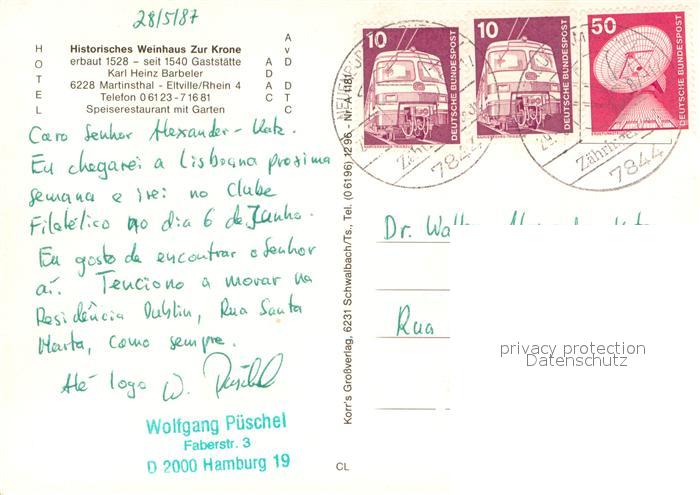 73649240 alte Postkarte Martinsthal Historisches Weinhaus Zur Krone Gastraum Fachwerkhaus postalisch gelaufen Erhaltung siehe scans [FriedD77] KatCode: 11110006439003