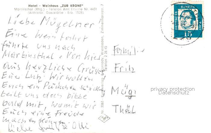 73795434 alte Postkarte Martinsthal Hotel Weinhaus Zur Krone postalisch gelaufen Erhaltung siehe scans [WerneD78] KatCode: 11110006439003