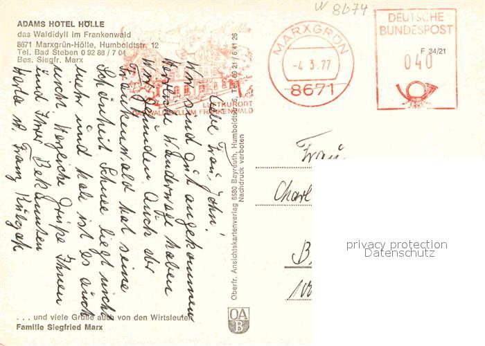 72885144 alte Postkarte Marxgruen Adams Hotel Hoelle Teufelssteg Hotelgarten Hirschensprung Neues Wasserhaus postalisch gelaufen Erhaltung siehe scans [WerneD78] KatCode: 11110009475156