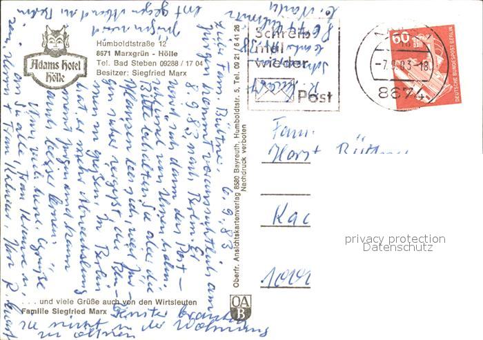 71961415 alte Postkarte Marxgruen Adams Hotel Hoelle postalisch gelaufen Erhaltung siehe scans KatCode: 11110009475156