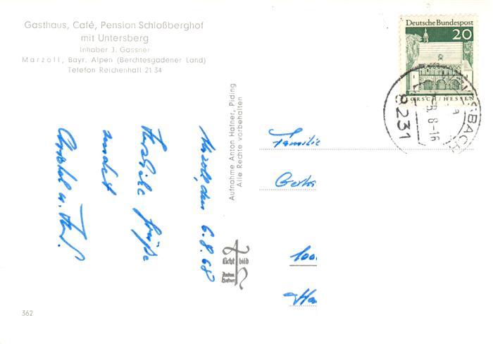 73896426 alte Postkarte Marzoll Gasthaus Cafe Pension Schlossberghof mit Untersberg postalisch gelaufen Erhaltung siehe scans [WerneD78] KatCode: 11110009172114