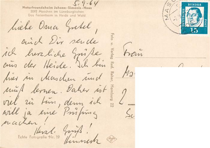 73896355 alte Postkarte Maschen Naturfreundeheim Johann-Simonis-Haus Lueneburger Heide postalisch gelaufen Erhaltung siehe scans [FriedD77] KatCode: 11110003353031