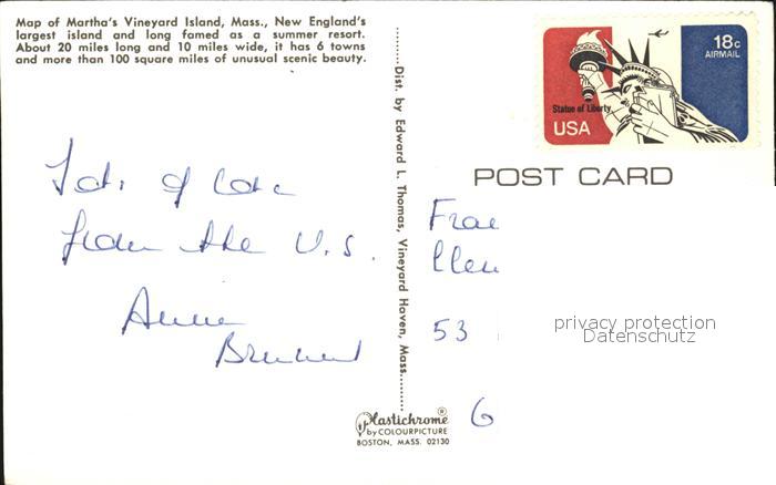 72476764 old postcard Massachusetts USA Mathals Vineyard Island Lageplan postalisch gelaufen Erhaltung siehe scans KatCode: 14140