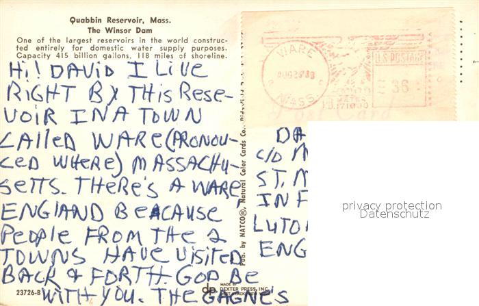 73061535 old postcard Massachusetts USA Quabbin Reservoir The Winsor Dam postalisch gelaufen Erhaltung siehe scans [WerneD78] KatCode: 14140