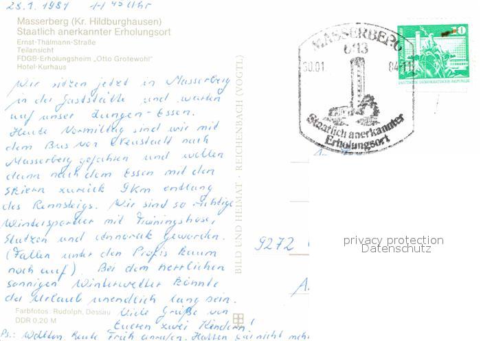 72652097 alte Postkarte Masserberg Ernst Thaelmann Strasse Teilansicht FDGB Erholungsheim Otto Grotewohl Hotel Kurhaus postalisch gelaufen Erhaltung siehe scans [FriedD77] KatCode: 11110016069061