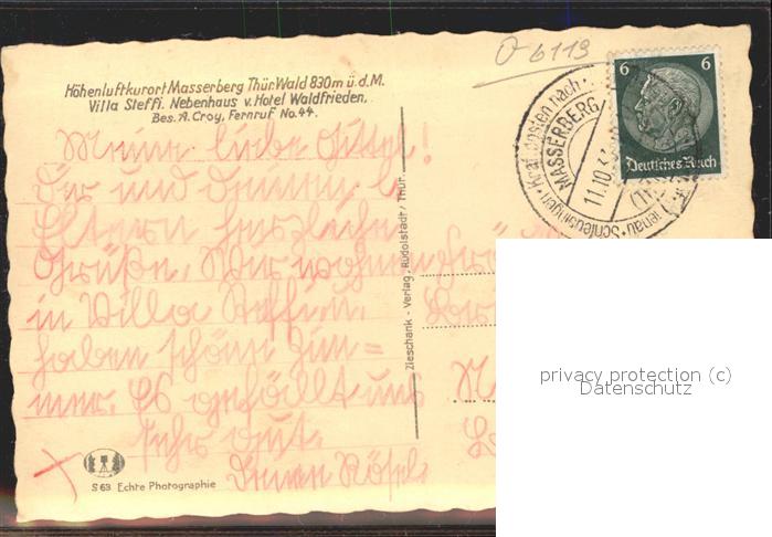 41447749 Masserberg Hildburghausen Thueringen Kurhotel Waldfrieden Villa Steffi Hoehenluftkurort postalisch gelaufen Erhaltung siehe scans Alte Ansichtskarte Postkarte alte Postkarte hz_F Katcode 11110016069061