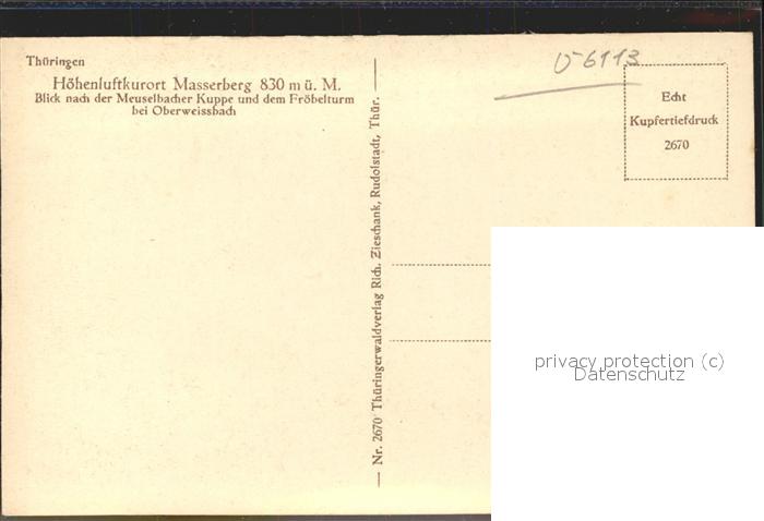 41447687 Masserberg Hildburghausen Thueringen Panorama Hoehenluftkurort mit Meuselbacher Kuppe Froebelturm Oberweissbach Kupfertiefdruck postalisch nicht gelaufen Erhaltung siehe scans Alte Ansichtskarte Postkarte hz_F Katcode 11110016069061
