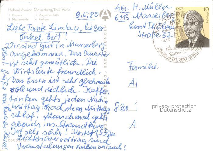 72411288 alte Postkarte Masserberg Kurpark Massermuehle Kurhaus Augenheilstaette postalisch gelaufen Erhaltung siehe scans KatCode: 11110016069061