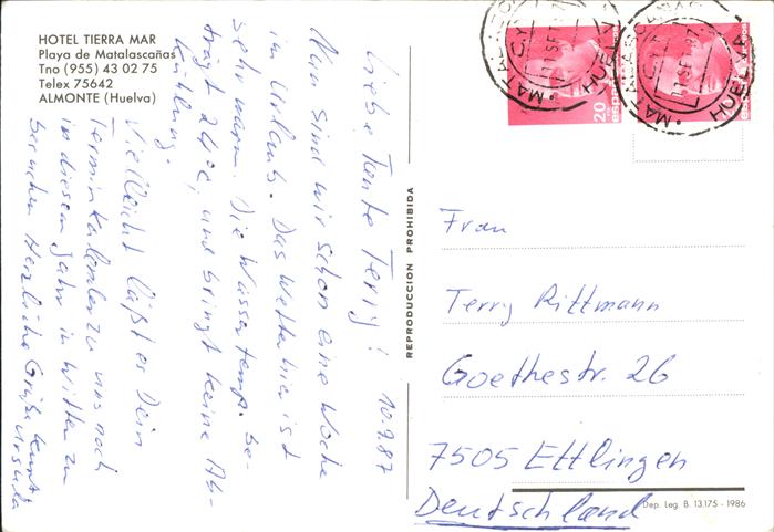old postcard Matalascanas Hotel Tierra Mar Playa vista aerea postalisch gelaufen Erhaltung siehe scans