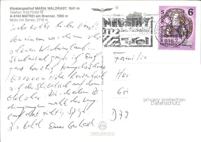 72483681 alte Postkarte Matrei Brenner Klostergasthof Maria Waldrast Fliegeraufnahme postalisch gelaufen Erhaltung siehe scans KatCode: 11390332070327