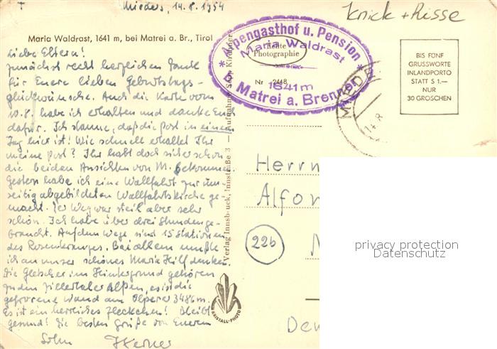 73098622 alte Postkarte Matrei Brenner Pension Maria Waldrast postalisch gelaufen Erhaltung siehe scans [KathaD81] KatCode: 11390332070327