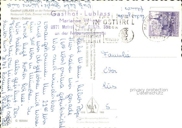 72494513 alte Postkarte Matrei Osttirol Gasthof Lublass Felbertauernstrasse postalisch gelaufen Erhaltung siehe scans KatCode: 11390333070717